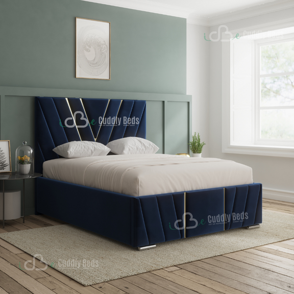 The headboard of the Sadie Bed, which functions as a magnificent centerpiece, is its distinguishing characteristic. The headboard, which draws inspiration from the tall skyscrapers of global cities, features exquisitely designed lines that evoke the majesty and sophistication of metropolitan architecture. Two golden stripes elegantly cover each side of the headboard, highlighting its regal presence and adding a dash of glitz.